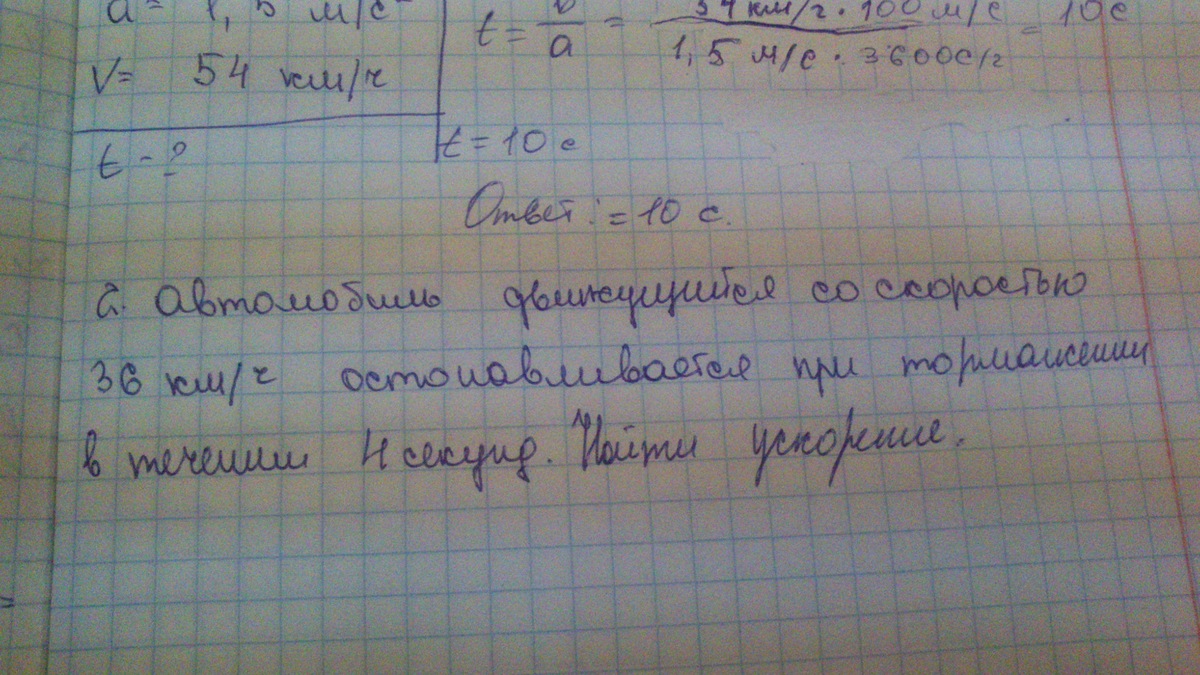 Автомобиль движется со скоростью 36 км/ч останавливается при торможении в течении 4 секунд. Найти ускорение.
