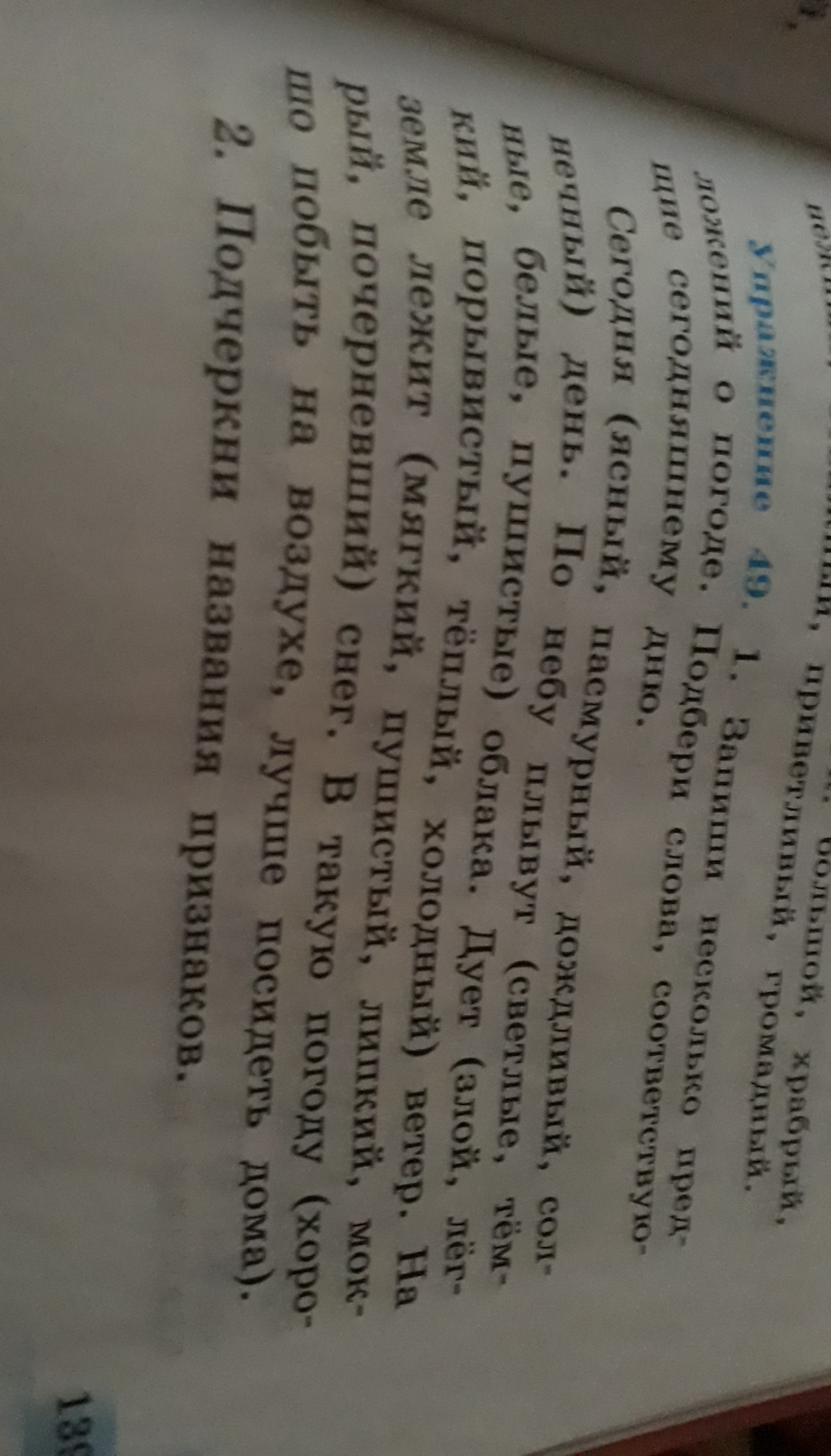 Сегодня ясный(прилагат., подчерк. волнистой линией), солнечный(прилагат., подчерк. волнистой линией) день. По небу плывут светлые(прилагат., подчерк. волнистой линией), белые(прилагат., подчерк. волнистой линией), пушистые(прилагат., подчерк. волнистой линией) облака. Дует лёгкий(прилагат., подчерк. волнистой линией), тёплый(прилагат., подчерк. волнистой линией) ветер. На земле лежит мягкий(прилагат., подчерк. волнистой линией), пушистый(прилагат., подчерк. волнистой линией) снег. В такую погоду хорошо(наречие, подчерк.пунктиром) побыть(сказуемое, подчерк. 2 чертами) на воздухе(обстоят., подчерк. пунктир-точкой).