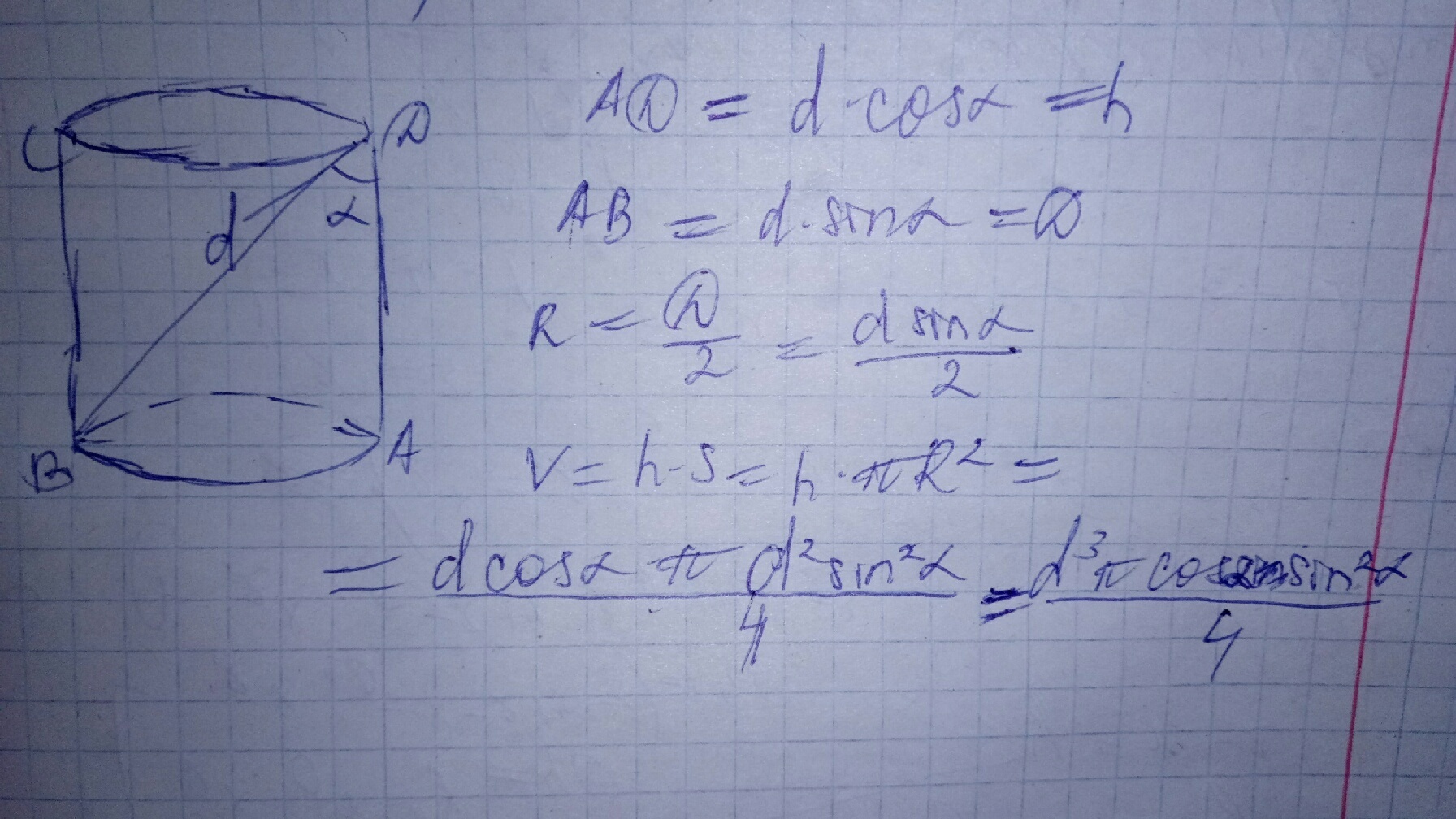 Диагональ осевого сечения цилиндра равна d и образует с образующей угол α. Объем данного цилиндра равен