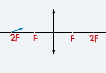 Постройте изображение в собирающей линзе короткой стрелки, наклоненной к оптической оси линзы. Нижний конец стрелки расположен на главной оптической оси на двойном фокусном расстоянии от линзы.