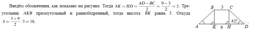 в равнобедренной трапеции основания равны 3 и 9 а один из углов между боковой стороной и основанием равен 45 градусов Найдите площадь этой трапеции