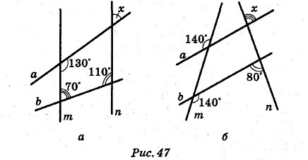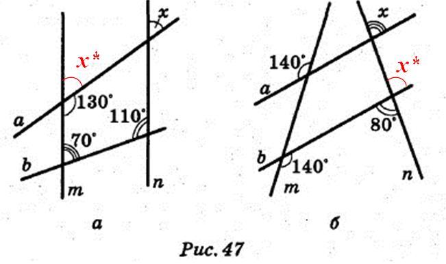 Чертёж а). Рассмотрим параллельные прямые m и n и секущую а. Тогда ∠х и ∠х* соответственные, то есть ∠х=∠х*. Из-за смежности угла ∠х* с углом, мера которого 130° получим, что 130°+∠х* = 180° или ∠х=∠х*=50°.