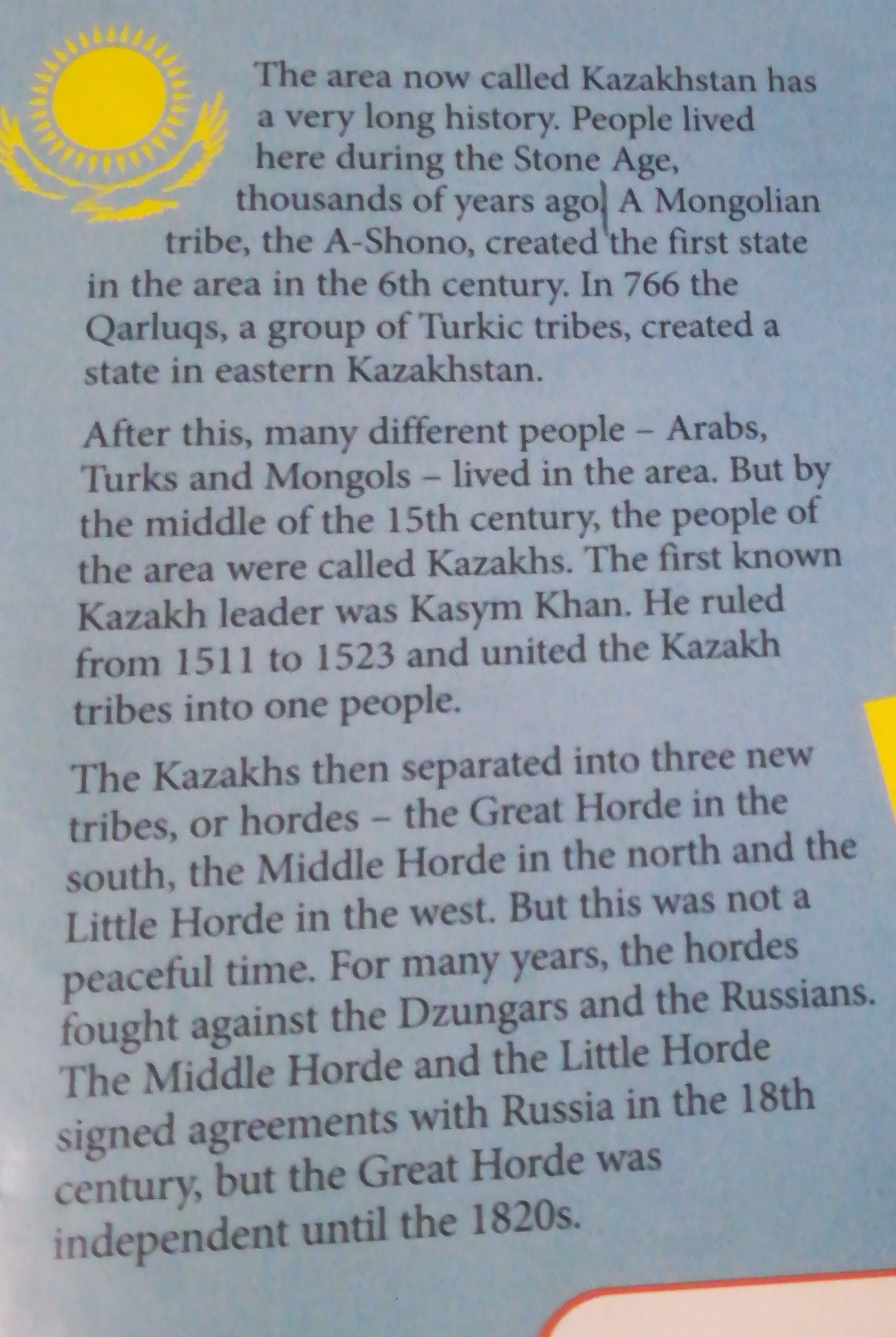 После этого множество людей, арабы, тюрки и монголы жили здесь. Но к середине 15 века, люди этой местности начали называться Казахами. Первого известного казаха звали Касым Хан. Он правил с 1511-1523 и казахские племена объединились.