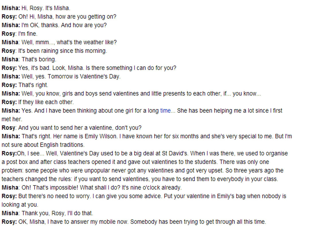 Оу, ясно... Итак, День Св. Валентина был большим событием в Сент-Девиде. Когда я была там, мы делали почтовую коробку, после уроков учителя открывали её и раздавали валентинки ученикам. Только была одна проблема: те, кто не были популярны никогда не получали валентинки и очень расстраивались из-за этого. Поэтому, 3 гда назад учителя изменили правила: если хочешь послать валентинку, ты должен послать каждому в классе.