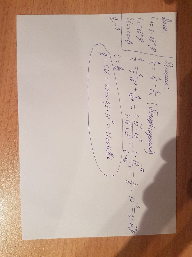 Батарея из последовательно соединенных конденсаторов с емкостями C1 = 5∙10^-9 и C2 = 10^-9 Ф заряжена под напряжением U = 2 кВ. Какое количество электричества (заряда) запасено в батарее?