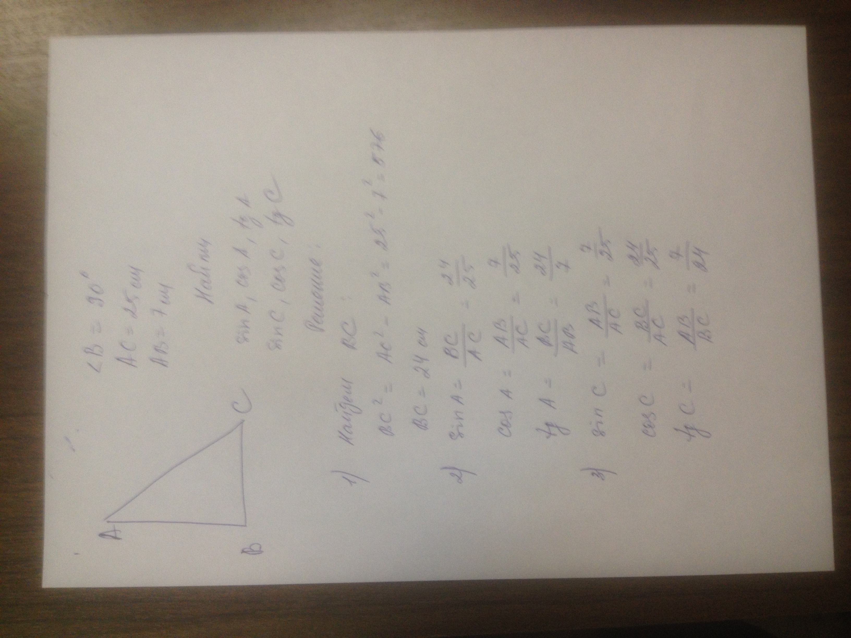Найдите синус,косинус и тангенс острых углов A и С прямоугольного треугольника ABC, если AC = 25см, AB = 7см.