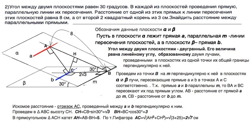 2)Угол между двумя плоскостями равен 30 градусов. В каждой из плоскостей проведения прямую, параллельную линии их пересечения. Расстояние от одной из этих прямых к линии пересечения этих плоскостей равна 8 см, а от второй 2 квадратный корень из 3 см.Знайдить расстояние между параллельными прямыми.