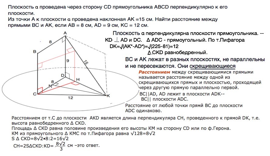 1)Плоскость альфа проведено через сторону CD прямоугольника АВСD перпендикулярную к его плоскости. Из точки А к плоскости альфа проведены наклонную АК = 15 см. Найти расстояние между прямыми ВС и АК, если АВ = 8 см, AD = 9 см, КС = 12 см.