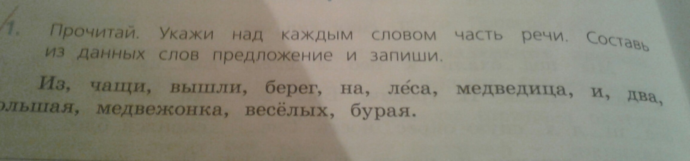 Из чащи леса вышли на берег большая бурая медведица и два веселых медвежонка чаща-сущ.,лес-сущ.,берег-сущ.,большая-прил.,бурая-прил.,медведица-сущ.,два-числ.,веселых-прил.,медвежонка-прил.