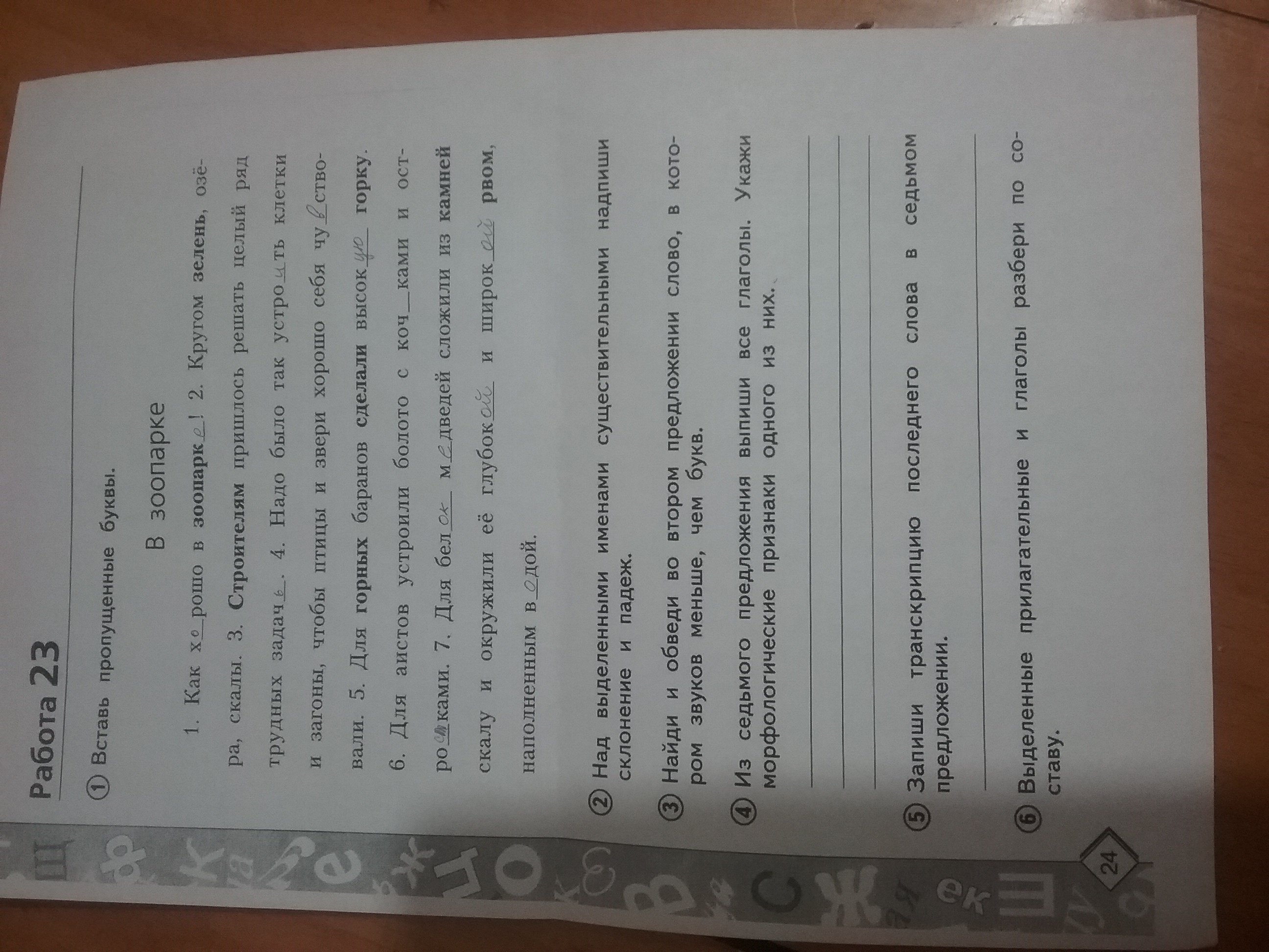 2.(склонение) в зоопарке (в чем?) П.п,зелень (кто?что?) И.п,строителям (кому?чему?) Д.п, для горных (кого?чего?) Р.п,горку (кого?что?) В.п,из камней (кого?чего?) Р.п,(кем?чем?) Т.п. 3. Слово зелень 4. Сори 5. Водой-[в а д о й’] 6. Горных-ых окончание,гор-корень,н-суффикс,сделали-и окончание,сдел-корень,суффикс а и л