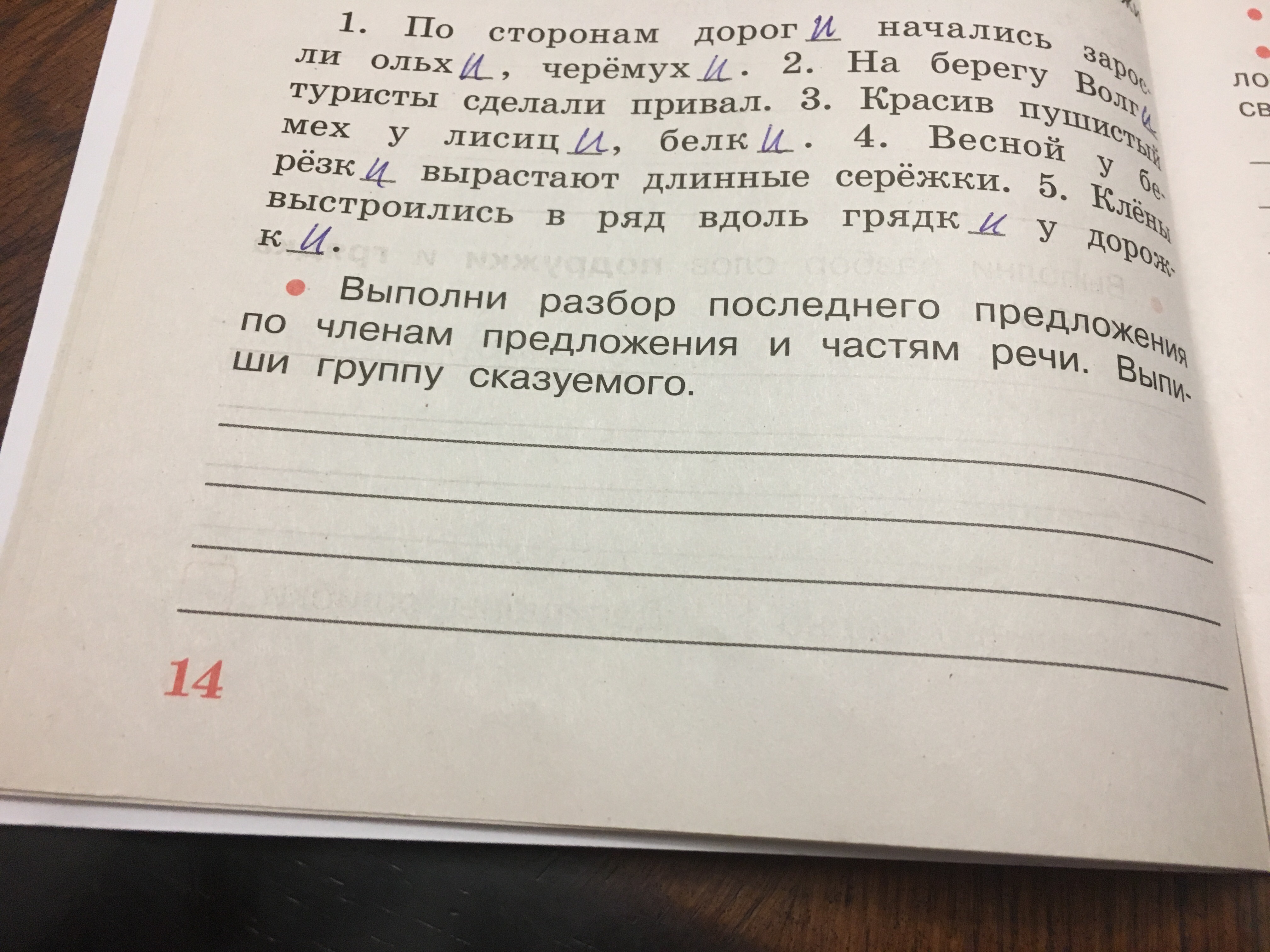 Помогите пожалуйста Выполни разбор последнего предложения по членам предложения и частям речи выпиши группу сказуемое