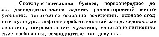 Светочувствительная бумага, первоочередное дело, двенадцатиэтажное здание, равносторонний многоугольник, пятитомное собрание сочинений, плодово-ягодные культуры, нефтеперерабатывающий завод, седоволосая женщина, широкоплечий мужчина, санитарно-гигиенические требования, семнадцатилетняя девушка.
