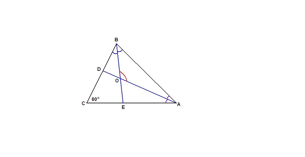В треугольнике ABC угол C равен 60 градусов, AD и BE-биссектрисы, пересекающиеся в точке O. Найдите угол AOB