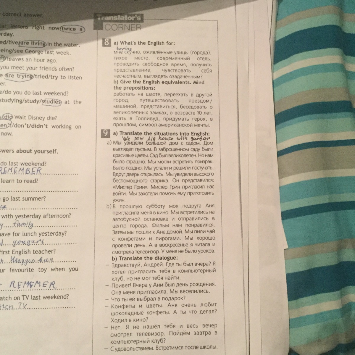 9.a)We saw a big house with a garden.The house looked empty.There was a beautiful flowers in an abandoned garden.The garden was brilliant.But we was scared.We could meet a ghost.It was late.We was tired and we decided to knock.Suddenly the door got open.We saw a toll helpless old man.He inroduced himself:Mr.Green.Mr Green invited us to come in.We wanted to help him to cook the dinner.