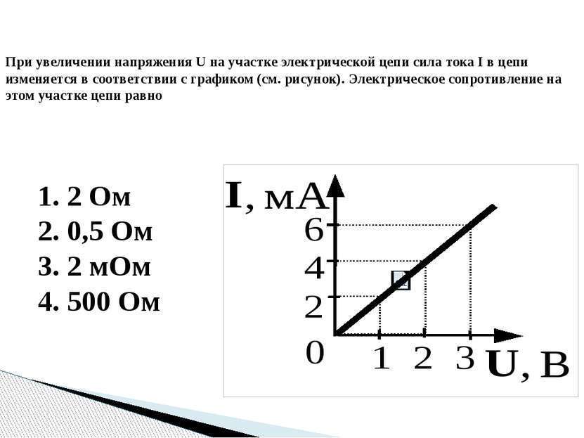 НА РИСУНКЕ ИЗОБРАЖЕН ГРАФИК ЗАВИСИМОСТИ СИЛЫ ТОКА В ПРОВОДНИКЕ ОТ НАПРЯЖЕНИЯ НА ЕГО КОНЦАХ ЧЕМУ РАВНО СОПРОТИВЛЕНИЕ ПРОВОДНИКА 1) 2 ОМ, 2) 0,5 ОМ 3) 2 МОМ, 4) 500 ОМ( ГРАФИК НА КАРТИНКЕ)