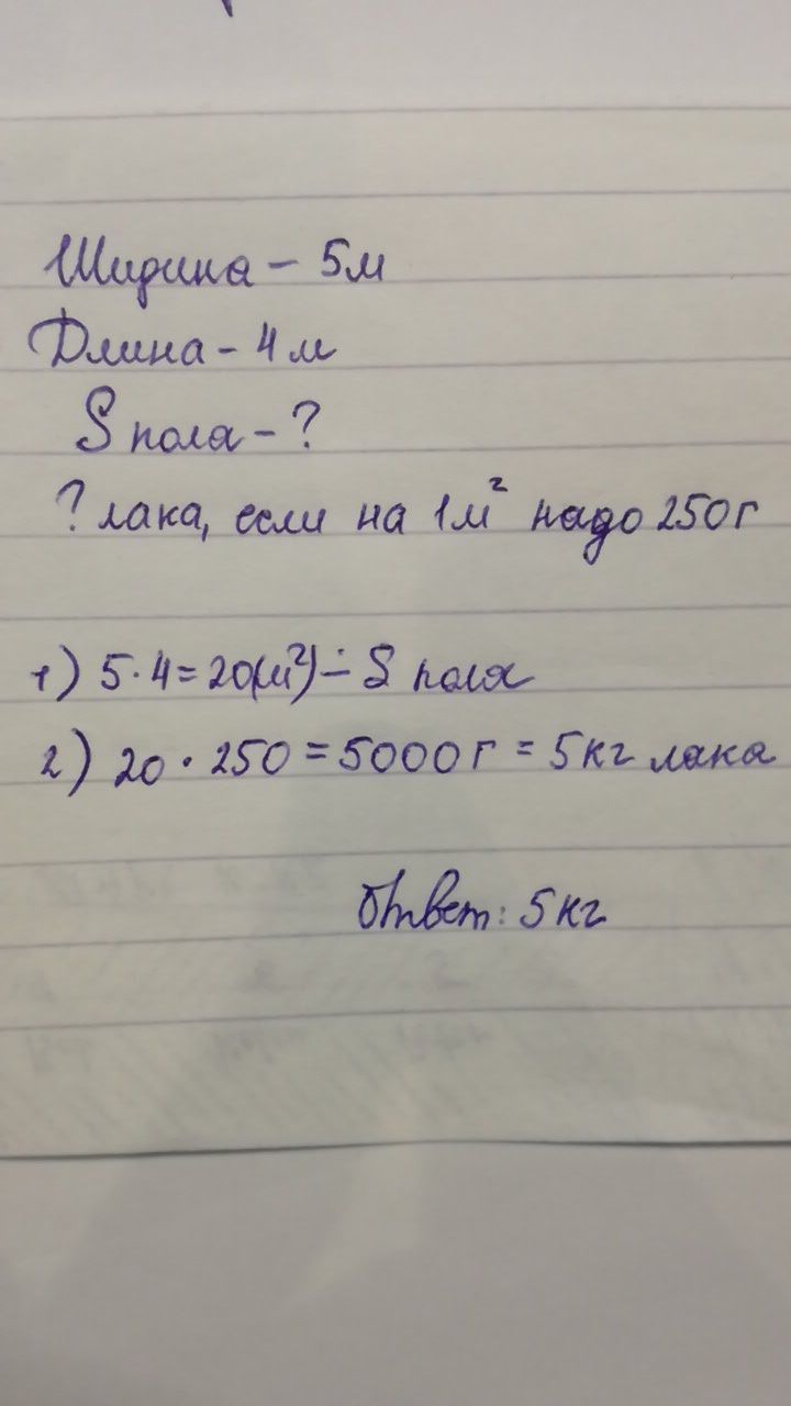 Ширина комнаты прямоугольной формы 5 м, а длина 4 м. Сколько потребуется лака для покрытия пола в этой комнате, если на 1м в квадрате расходуется 250 г молока?