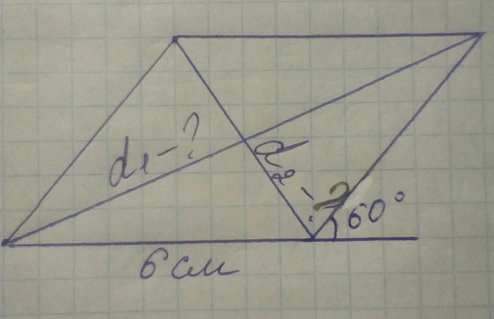 Угол, смежный с углом в 30 гр. =180-60=120. Его диагональ d2 делит пополам 120:2=60гр. т.е. получившийся остроугольный треугольник равносторонний. Тогда d2=6. из прямоугольного треугольника найдем по теореме Пифагора катет = 1/2d1. 1/2d1=6*sin60=6*корень из 3/2=3 корней из 3. тогда d1=6 корней из 3.
