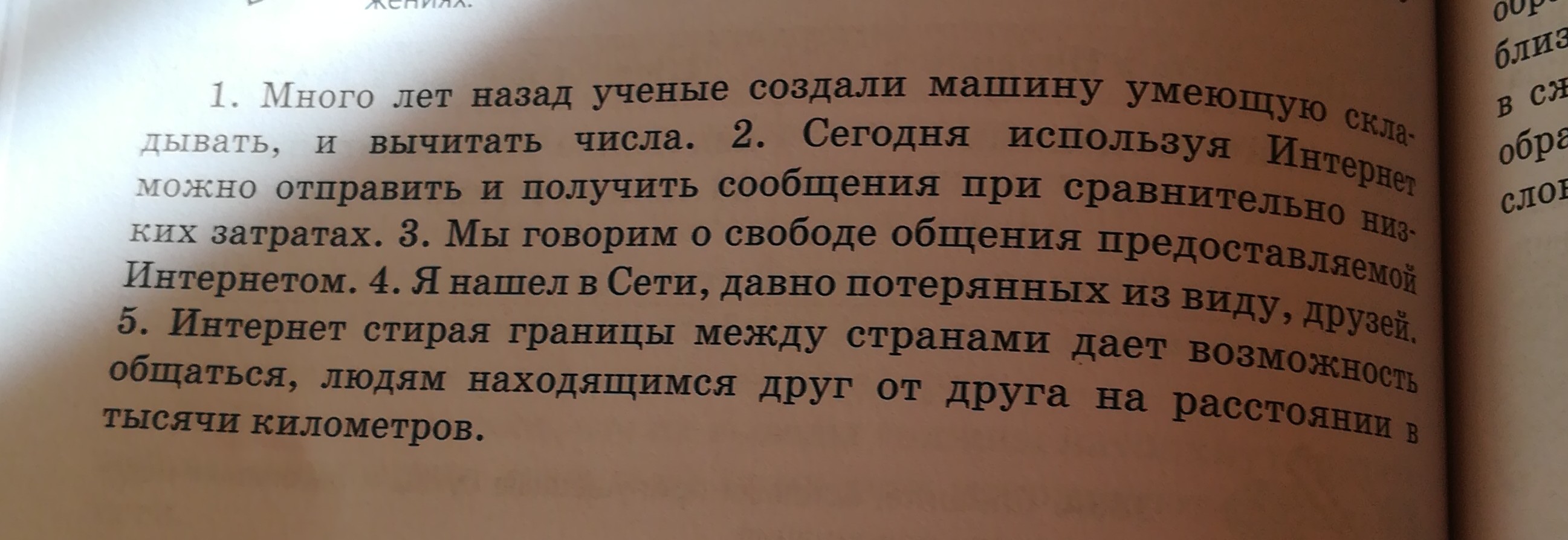 1. Много лет назад учёные создали машину, умеющую складывать и вычитать числа. 2. Сегодня, используя Интернет, можно отправить и получить сообщения при сравнительно низких затратах. 3. Мы говорим о свободе общения, предоставляемой Интернетом. 4. Я нашел в Сети давно потерянных из виду друзей. 5. Интернет, стирая границы между странами, даёт возможность общаться людям, находящимся друг от друга на расстоянии в тысячи километров.