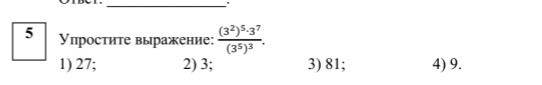frac{(3 ^{2}) ^{5}*3 ^{7} }{(3 ^{5}) ^{3}}= frac{3 ^{10}*3 ^{7} }{3 ^{15} }=3 ^{10+7-15}=3 ^{2}=9