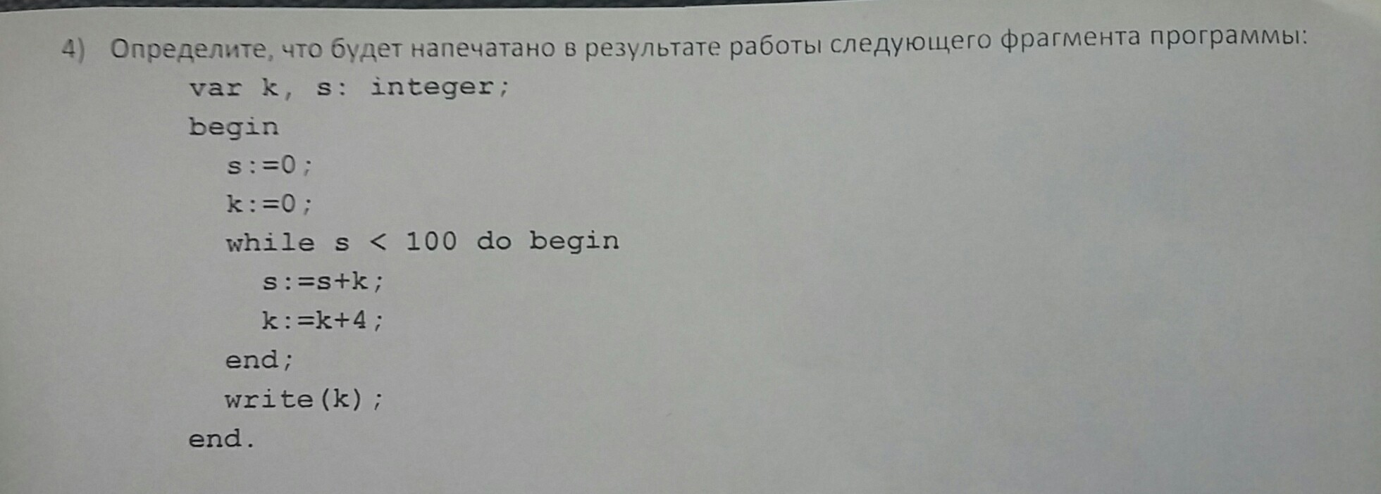 Program naconecto;vark,s:integer;BEGINs:=0;k:=0;while s<10 do begin s:=s+k; k:=k+4;end;write(k);END.