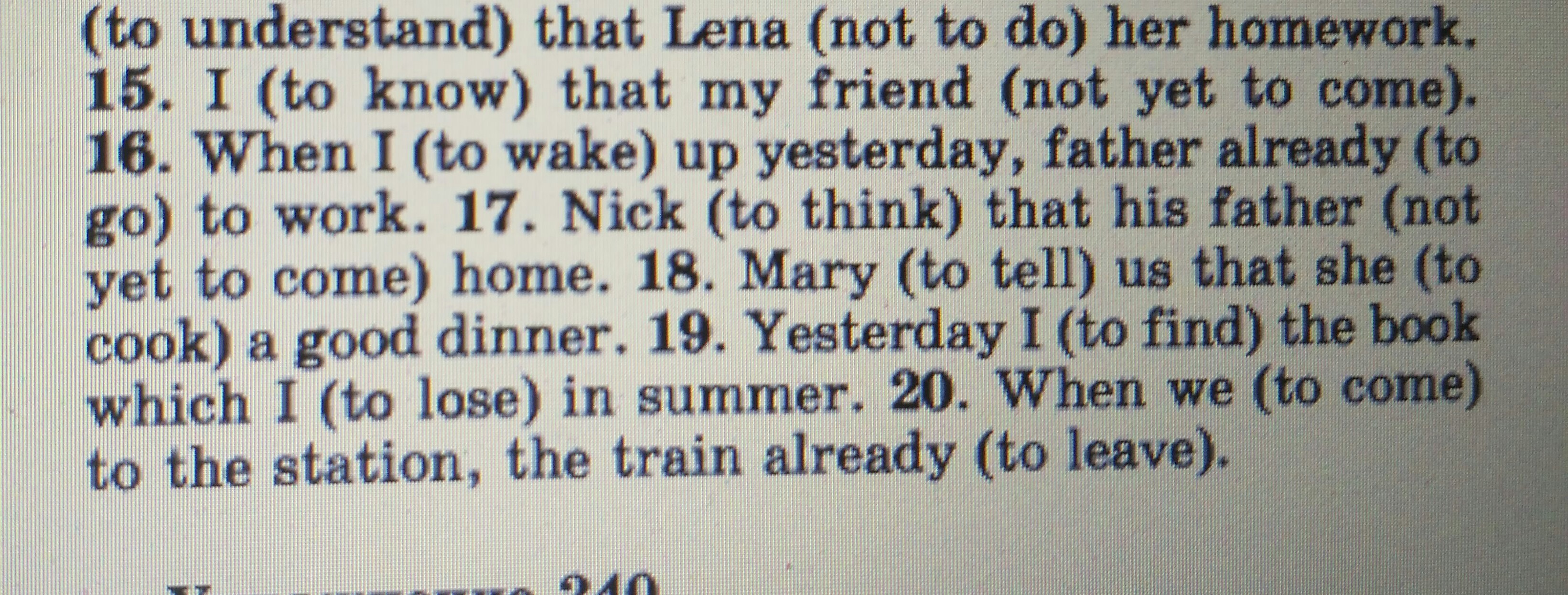 (чтобы понять), что Лена (не делать) свою домашнюю работу. 15. Я (чтобы знать), что мой друг (еще не пришел 16. Когда я (чтобы проснуться) вчера, отец уже (чтобы идти) на работу. 17. Ник (подумать), что его отец (еще не пришел ) 18. Мария (сообщите) нам, что она (чтобы приготовить) хороший обед. 19. Вчера я (чтобы найти) книгу, которую я (чтобы потерять) летом. 20. Когда мы (приехать) на станция, поезд уже (уйти).