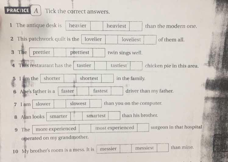 Heavier, loveliest, prettiest, tastiest, shortest, faster, slower, smarter, most experienced, messier
