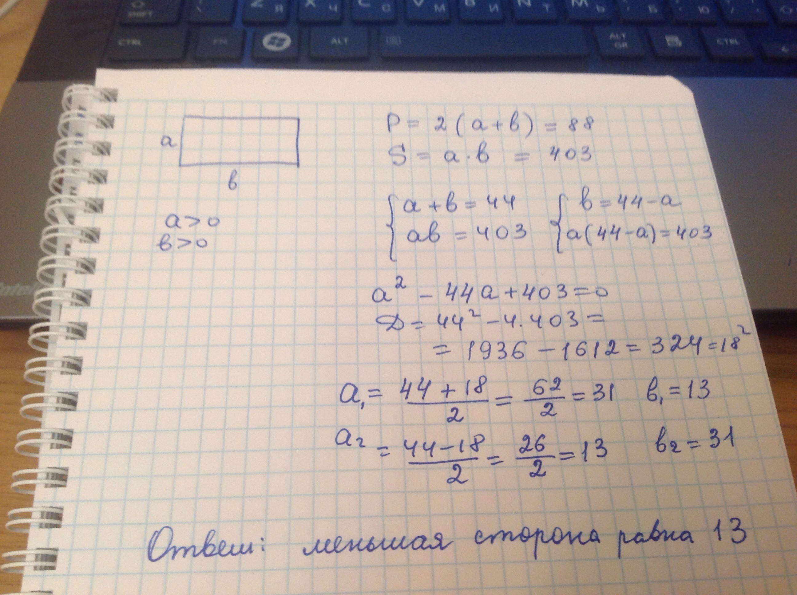 Периметр прямоугольника равен 88, а площадь 403. Найдите меньшую сторону прямоугольника.
