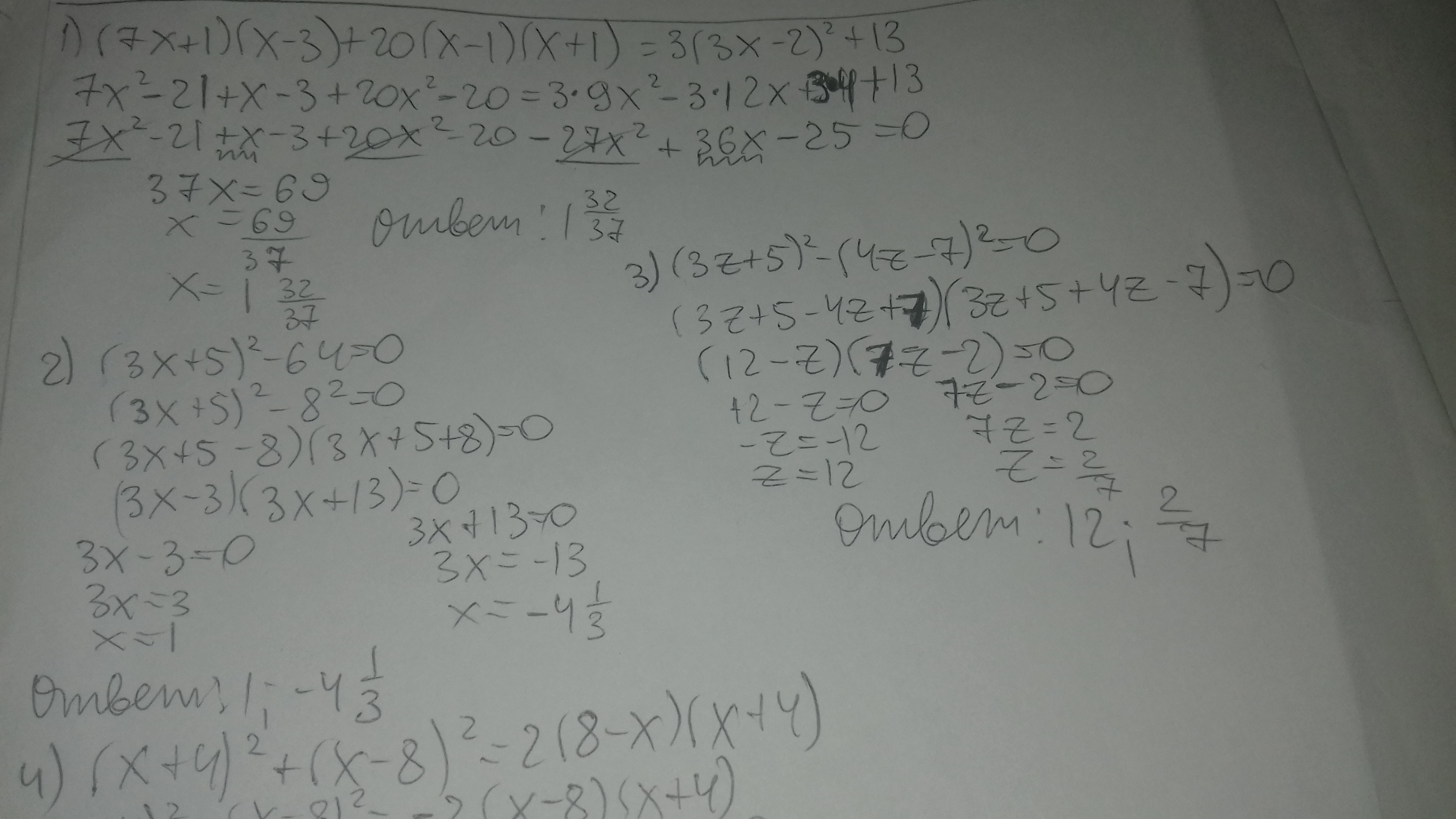 1)(7x+1)(x-3)+20(x-1)(x+1)=3(3x-2)²+13