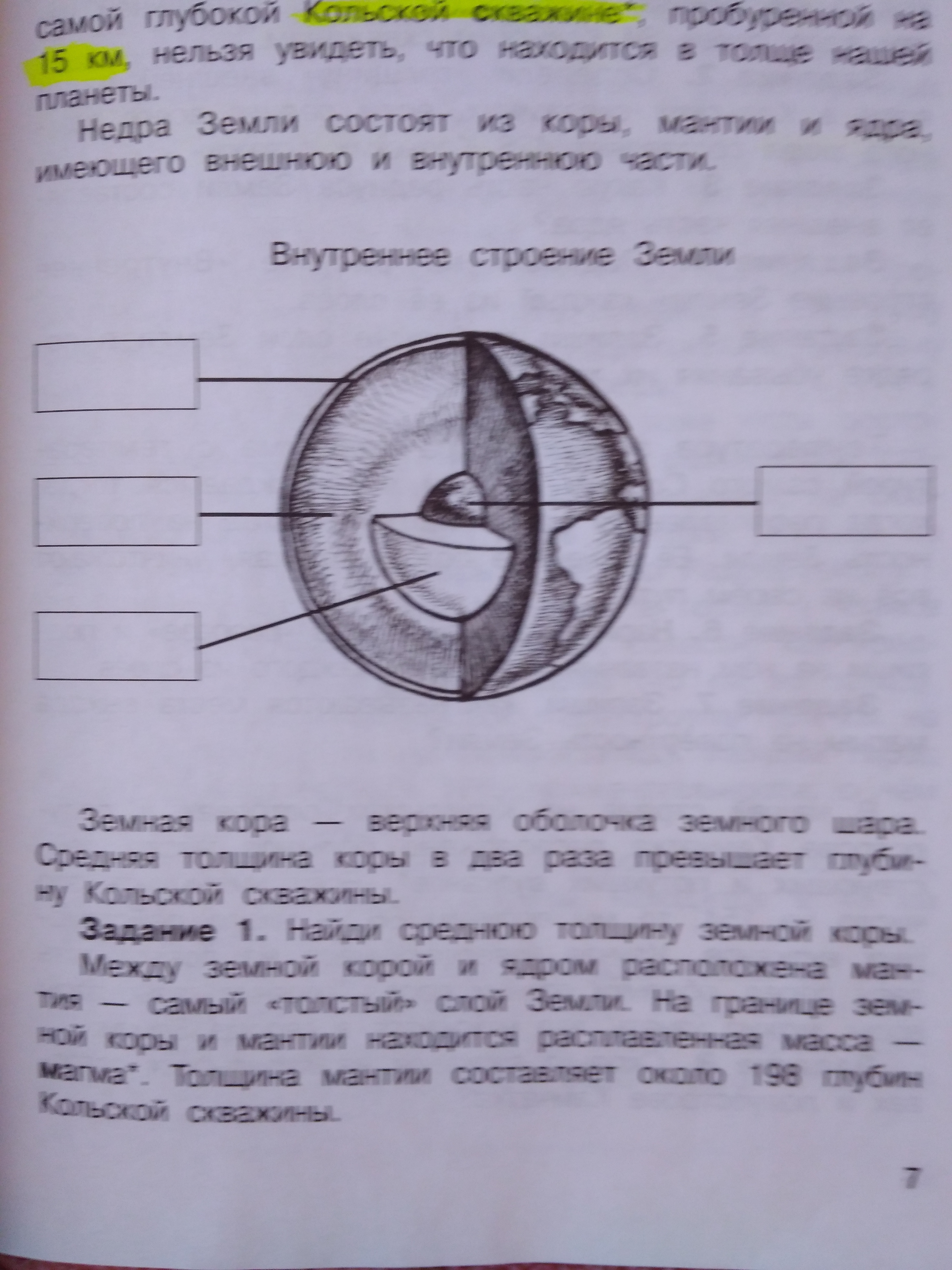 Сначала идёт земная кора потом мантия потом внешнее ядро и внутреннее.