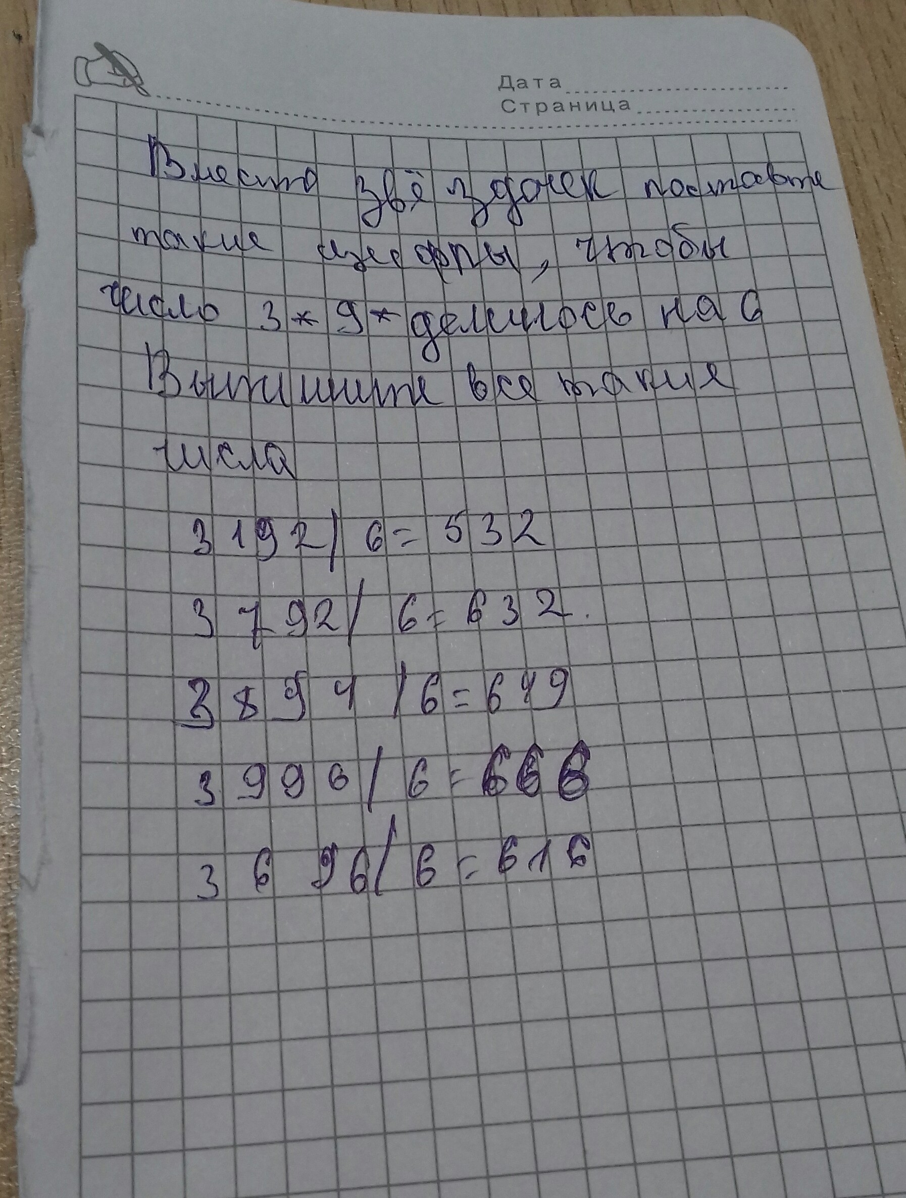 Вместо звёздочек поставить такие цифры, чтобы число 3*9*делилось на 6. Выпишите все такие числа.