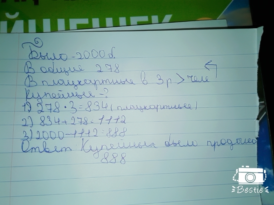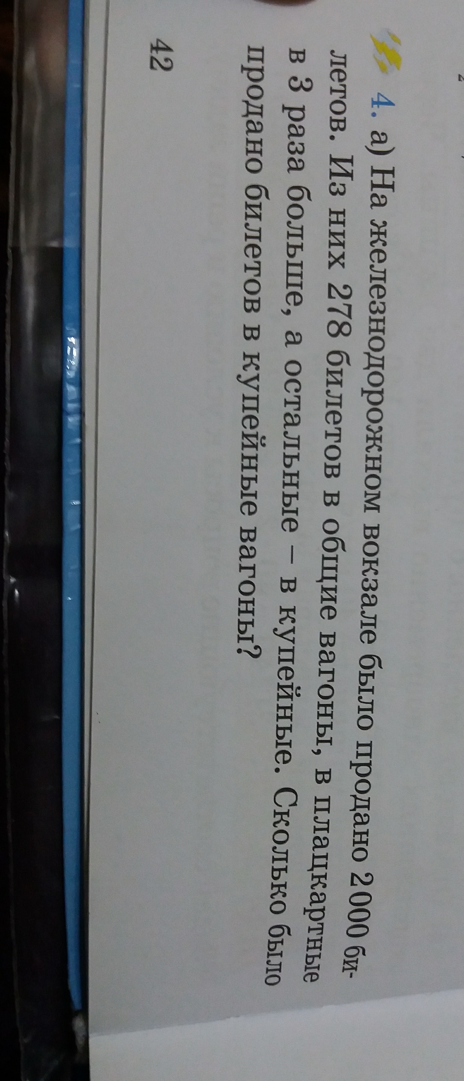 на железнодорожном вокзале было продано 2000 билетов из них 278 билета в общие вагоны в плацкартные три раза больше остальных купейные Сколько было продано билетов в купейные вагоны