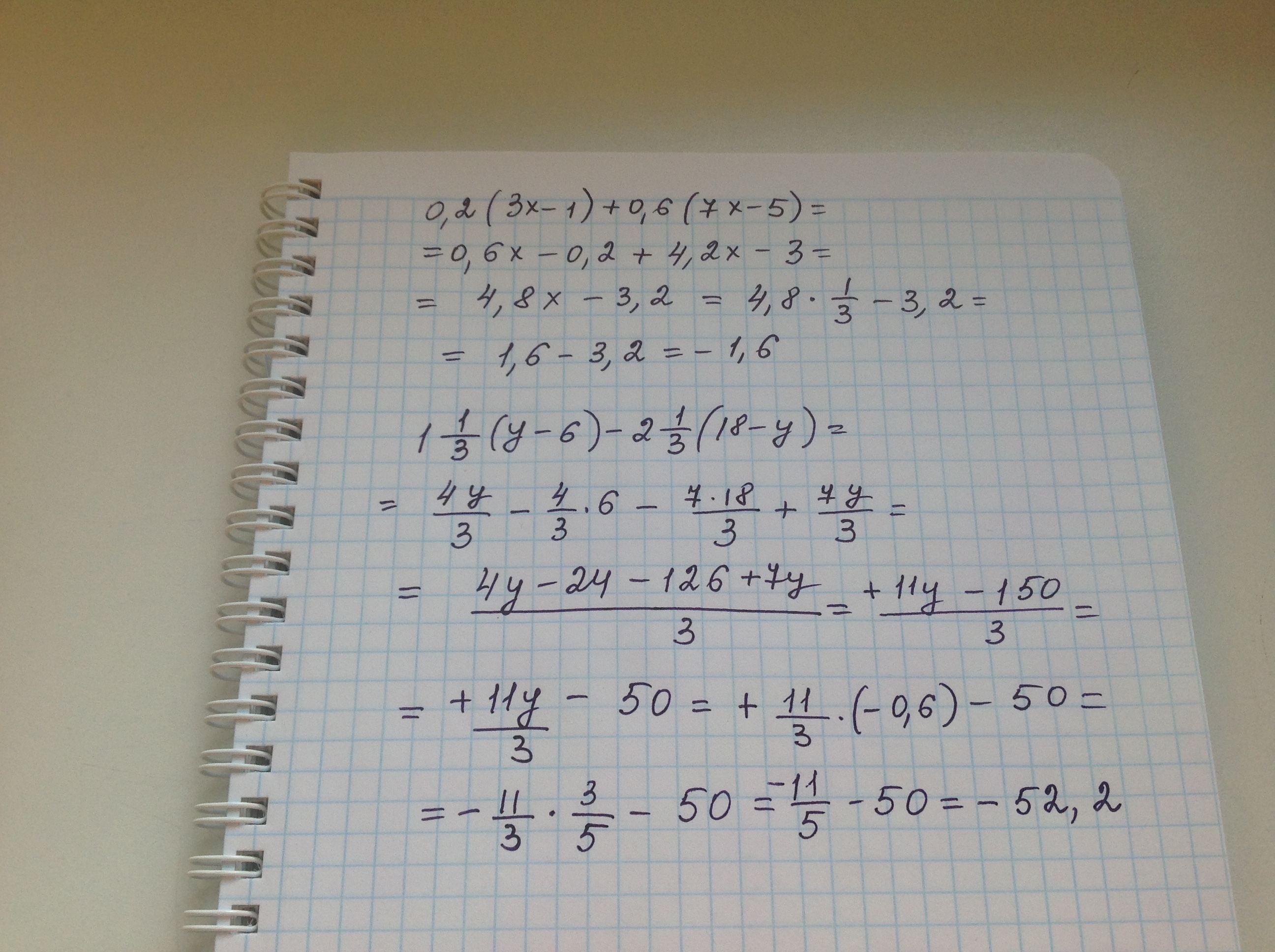 б)1 1/3(y-6)-2 1/3(18-y) при y=-0,6