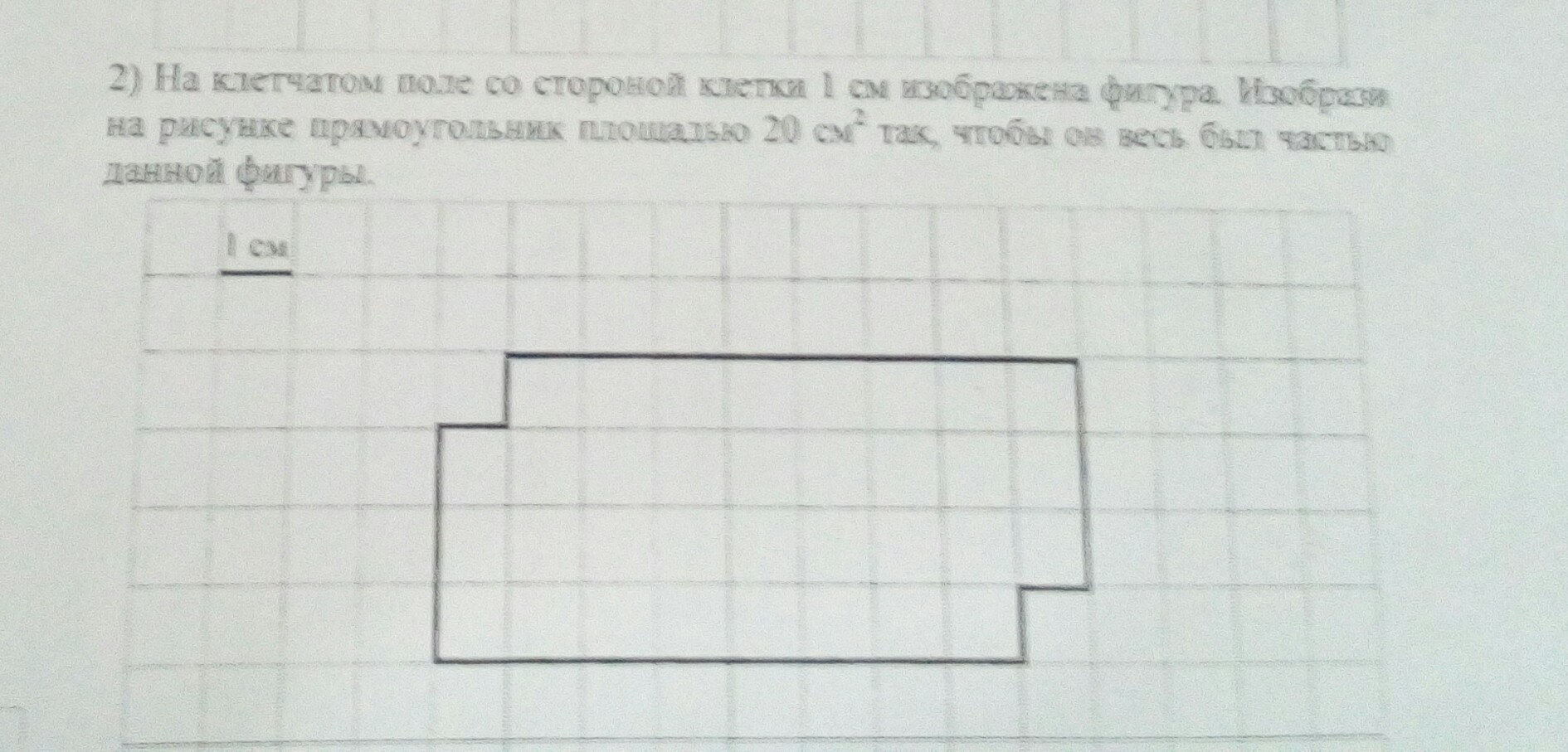на клетчатом поле со стороной клетки 1 см изображена фигура изобрази на рисунке прямоугольник площадью 20 см в квадрате так чтобы он весь был частью данной фигуры .