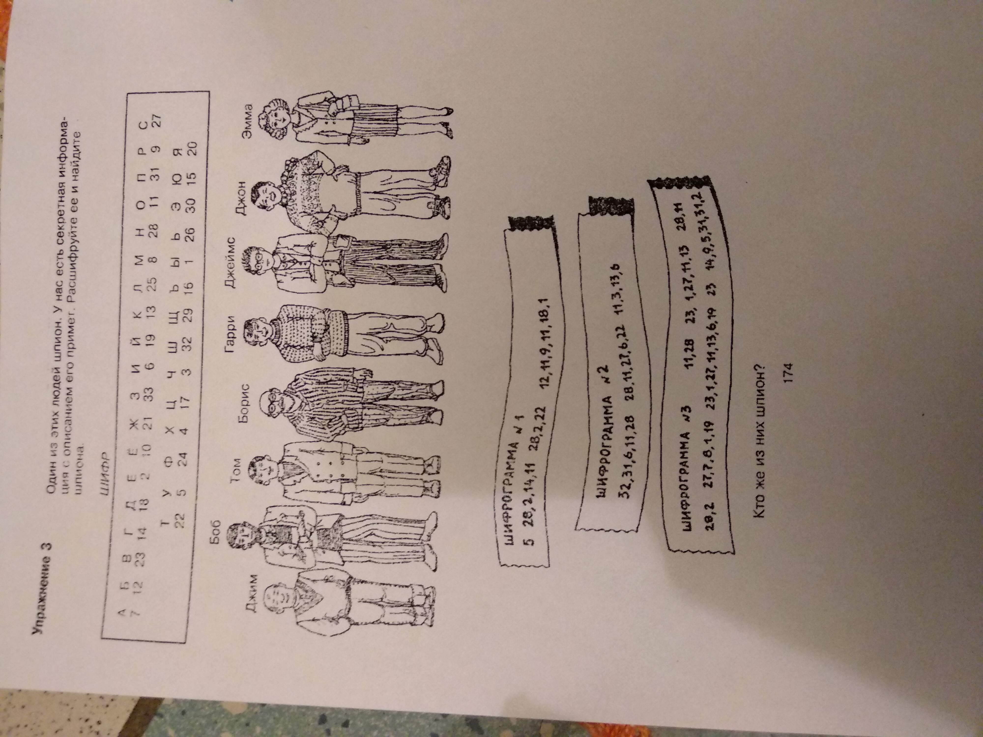 Один из этих людей шпион. У нас есть секретная информация с описанием его примет .Расшифруйте ее. Найдите шпиона. есть шифр с алфавитом ,шифрограмма номер один ,цифрограмма номер два ,шифрограмма номер три .кто же из них шпион