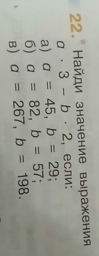 Найди значение выражения А умножить на 3 минус б умножить на 2 а равно 45 Б равно 29 а равно 82 б равно 57 а равно 267 Б равно 198