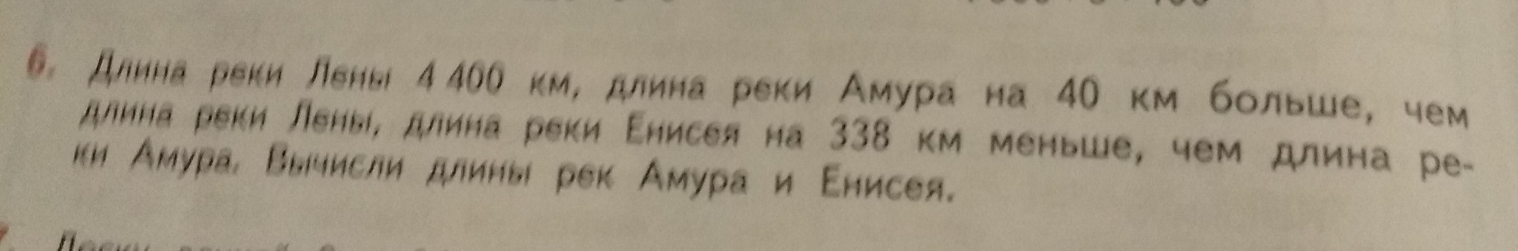 длина реки Лены 4400 км длина реки Амура на 40 км больше чем длина реки Лены длина реки Енисей на 338 км меньше чем длина реки Амура Вычисли длины рек Амура и Енисея