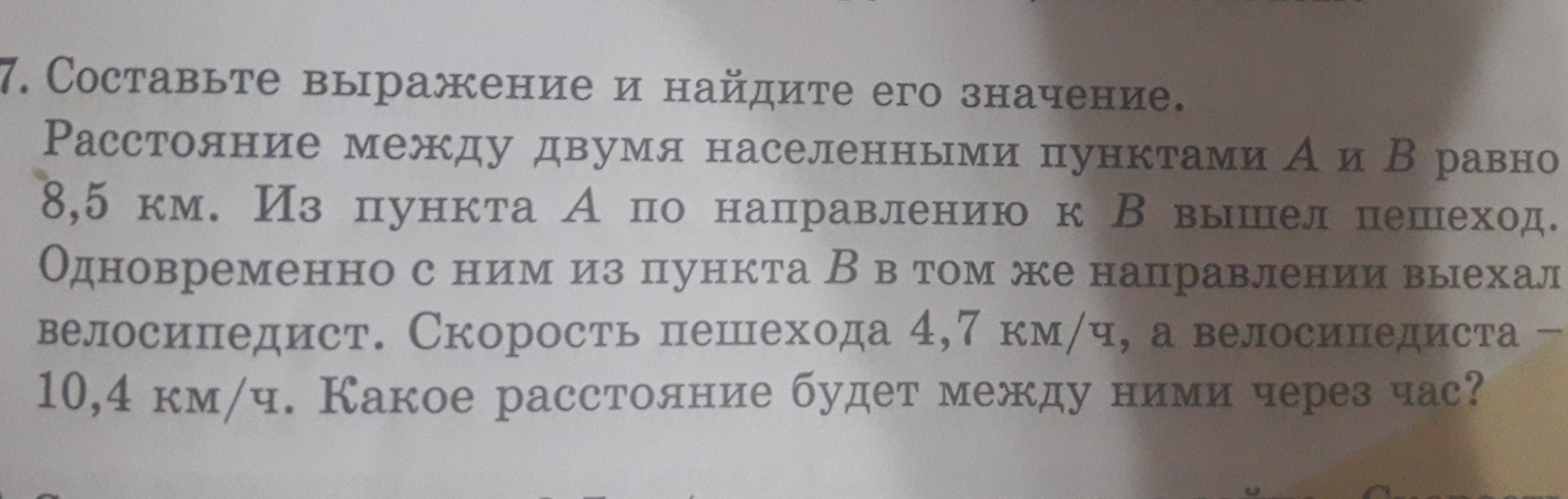 Изначально расстояние было 8,5. Представим, что пешеход стоит, а велосипедист проехал час. Расстояние стало 8,5+10,4=18,9. Теперь представим, что велосипедист стоит, а пешеход его догоняет. Расстояние становится 18,9-4,7=14,2