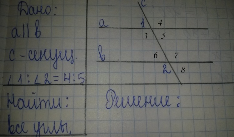 угол1+угол2=180 град, всего они составляют 4+5=9 частей, т.е. 1 часть=180/9=20 град, т.е. угол1=4*20=80 град