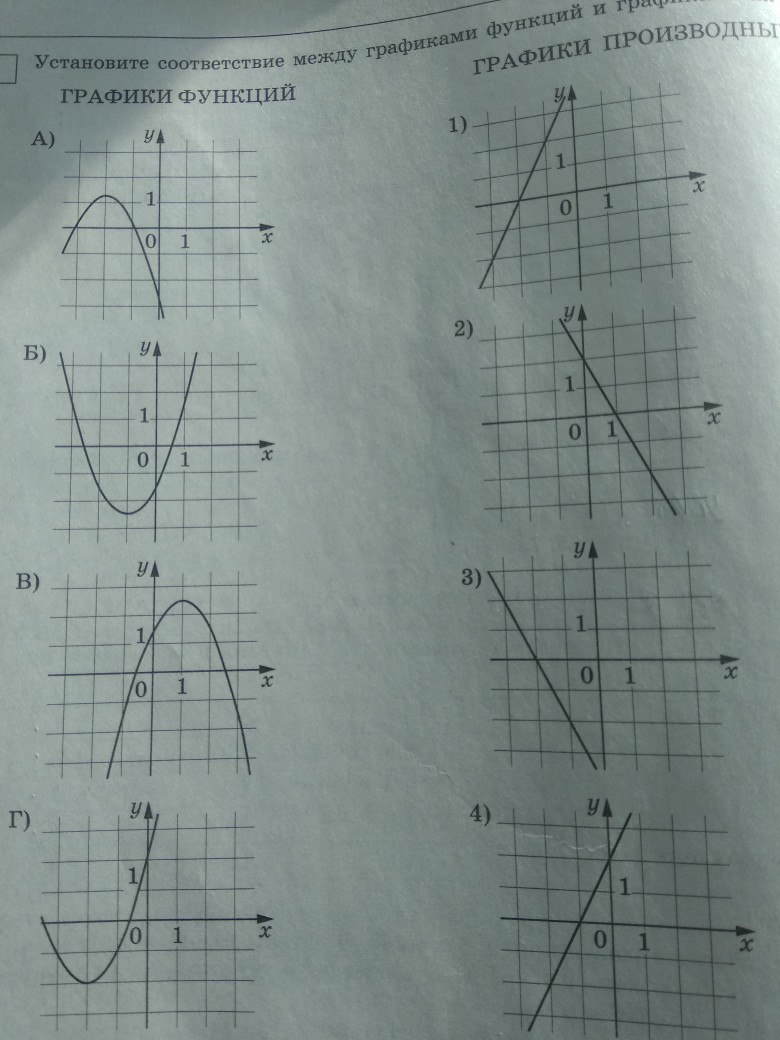 Установите соответствие между графиками функций и графиками их производной. Ответ важен в последнюю очередь. Объясните пожалуйста или дайте ссылку на объяснение.