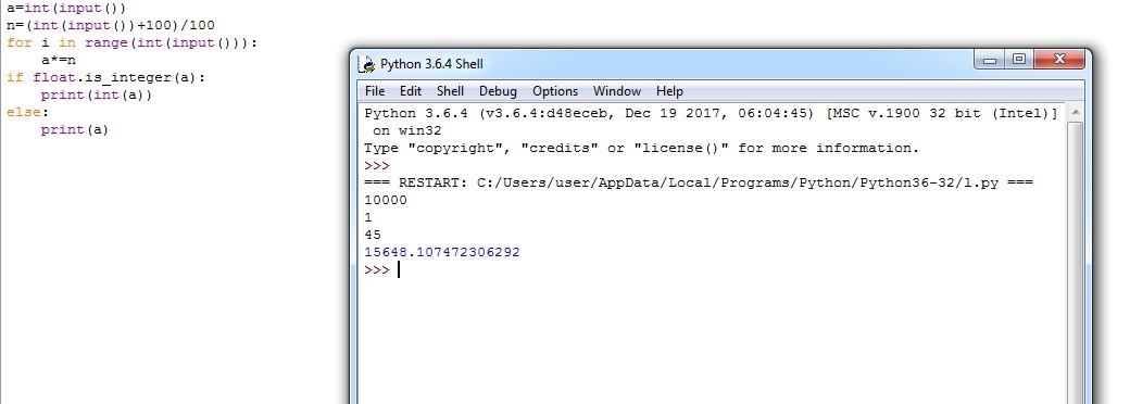 Вы получили кредит на сумму A рублей под N% в сутки (проценты начисляются на сумму долга ежедневно). Какую сумму в рублях вам придется вернуть через M дней? На входе в программу подаются А, N и M. Пример входных и выходных данных: входные данные 10000 1 45 выходные данные 15648.11