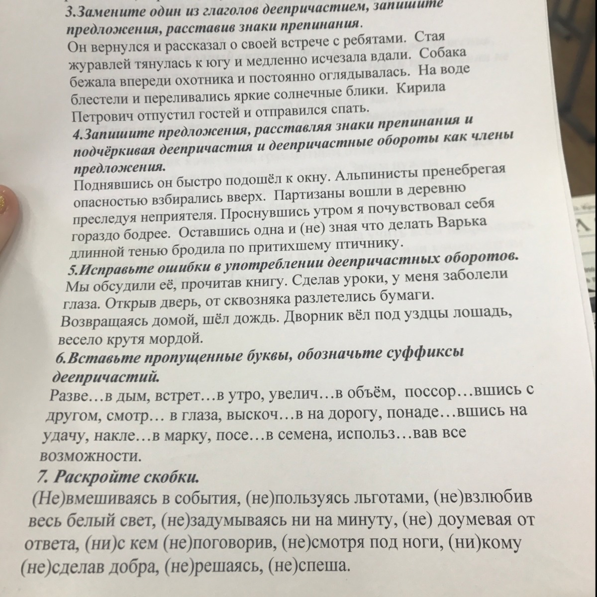 7. не вмешиваясь в события, не пользуясь льготами, невзлюбив весь белый свет, не задумываясь ни на минуту, недоумевая от ответа, ни с кем не поговорив, не смотря под ноги, никому не сделав добра, не решаясь, неспеша