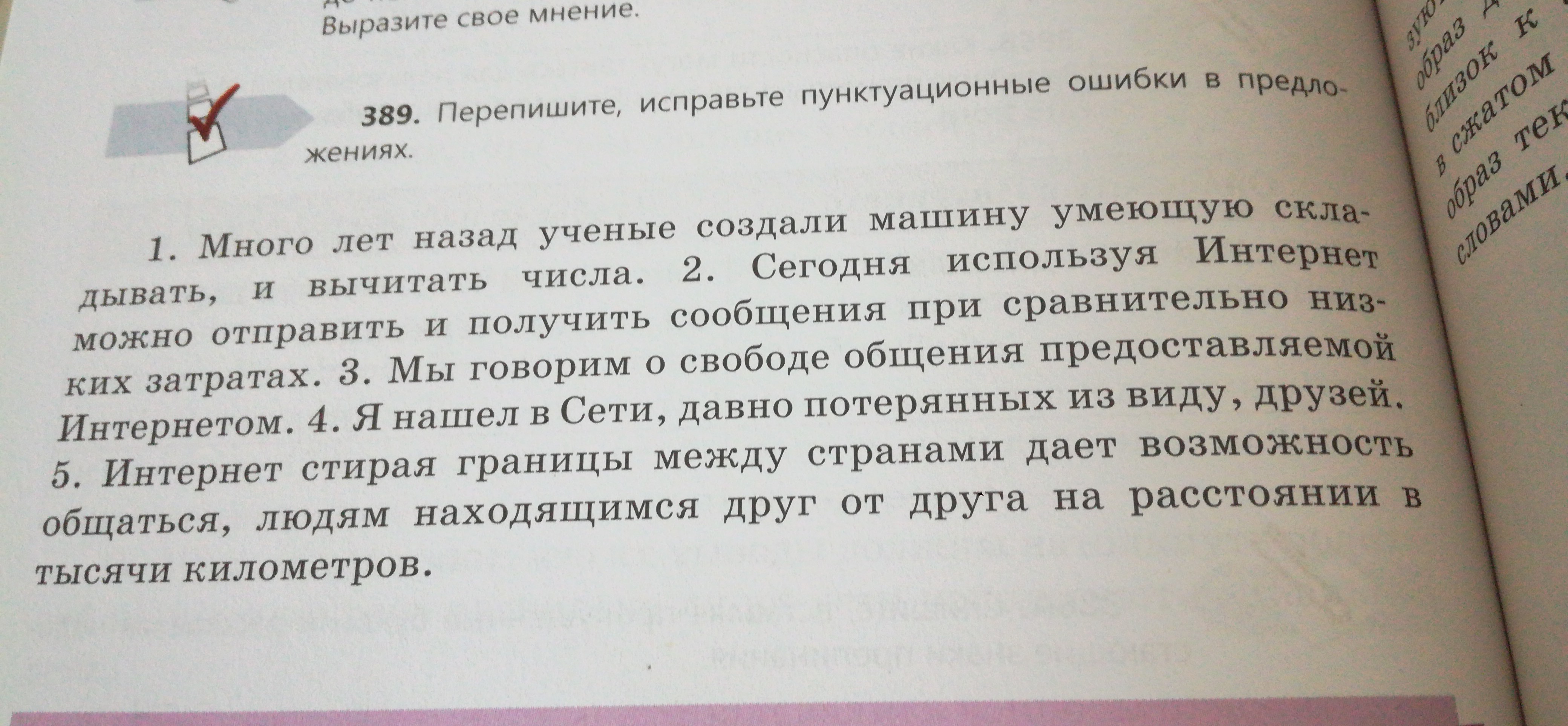 1. Много лет назад учёные создали машину, умеющую складывать и вычитать числа. 2. Сегодня, используя Интернет, можно отправить и получить сообщения при сравнительно низких затратах. 3. Мы говорим о свободе общения, предоставляемой Интернетом. 4. Я нашёл в Сети давно потерянных из виду друзей. 5. Интернет, стирая границы между странами, даёт возможность общаться людям, находящимся друг от друга на расстоянии в тысячи километров.