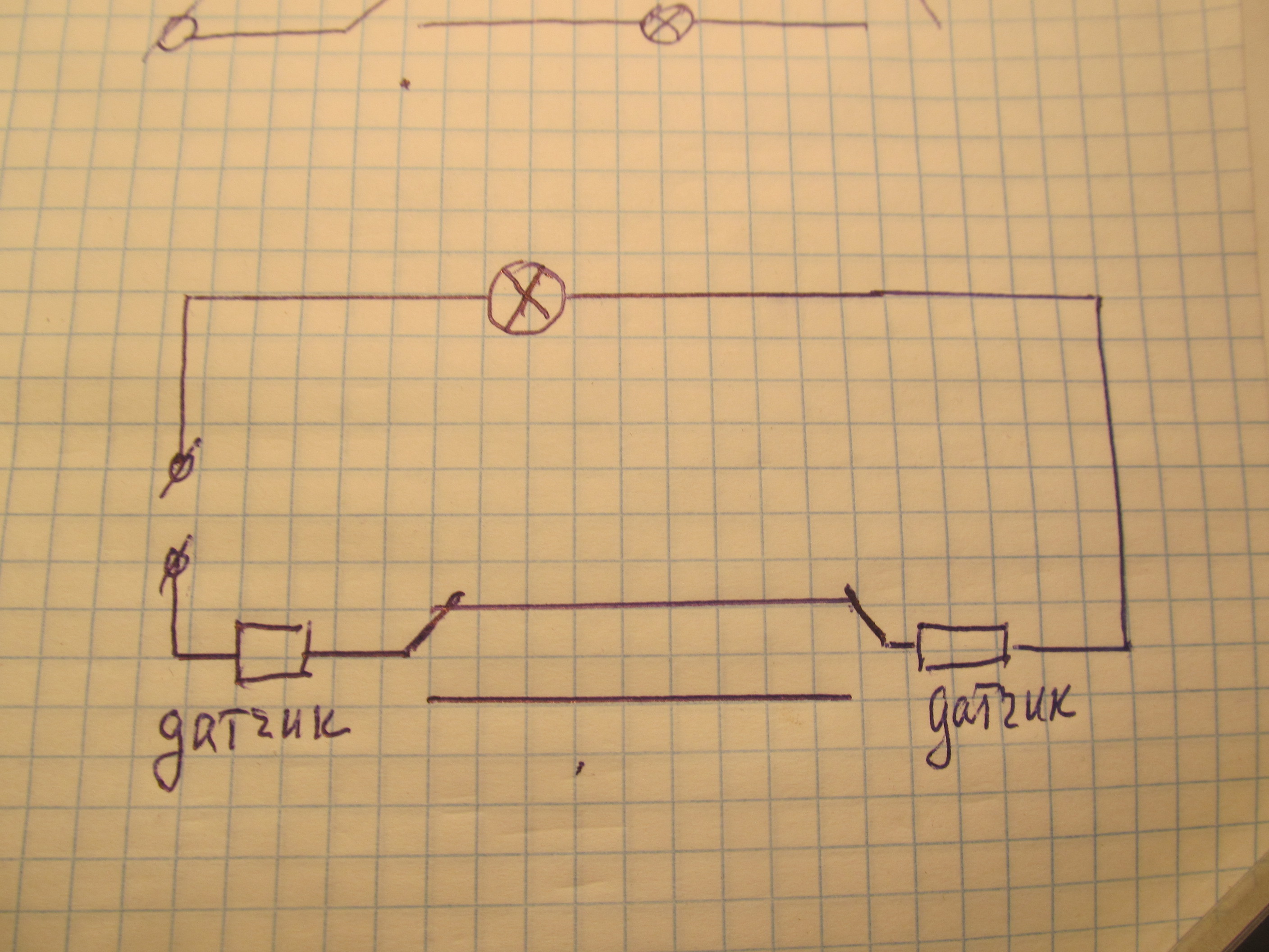 Схема подключения датчиков. Один трамвай подходит слева, датчик включает лампочку, после прохождения трамвая второй датчик выключает лампочку. Идет следующий трамвай пусть опять слева, датчик переводит выключатель, чтобы лампочка горела и т.д.