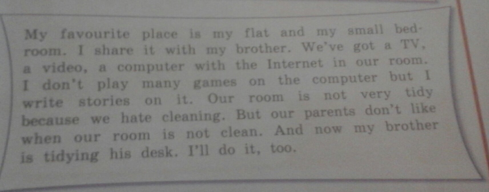 2.Самое лучше место-это мой дом и моя маленькая спальня. Я разделяю ее вместе со своим братом. В нашей комнате есть ТВ и компьютер с доступом в интернет.Я много не играю в компьютерные игры, а пеш на компьютере истории(рассказы). Наша комната выглядит не очень опрятно,потому что мы не любим делать уборку. Сейчас мой брат занимается уборкой его письменного стола. Я тоже занимаюсь этим.