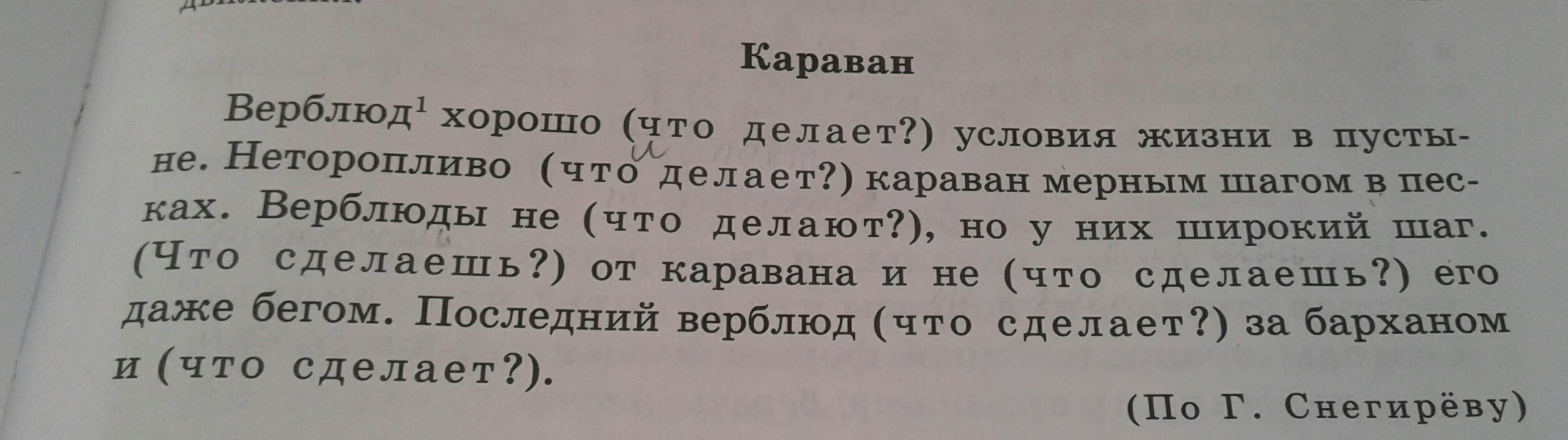 верблюд хорошо ПЕРЕНОСИТ условия жизни в пустыне. неторопливо ШАГАЕТ караван мерным шагом в песках. Верблюды не ТОРОПЯТСЯ, но у них широкий шаг. ОТСТАНЕШЬ от каравана и не ДОГОНИШЬ его даже бегом. Последний верблюд МЕЛЬКНЕТ за барханом и ИСЧЕЗНЕТ.