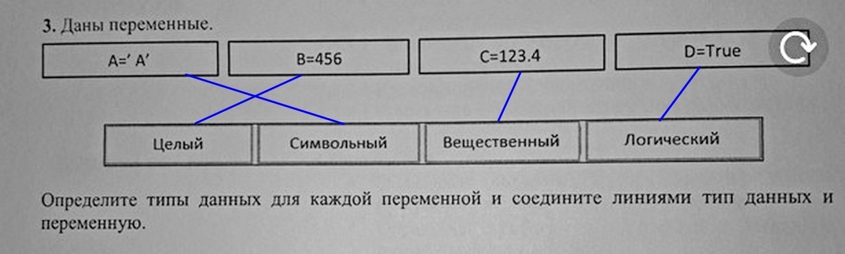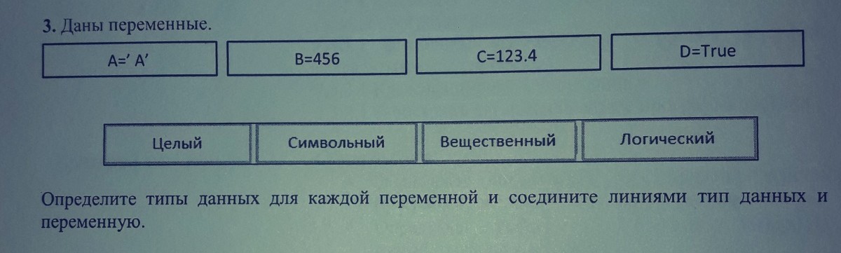 Определите типы данных для каждой переменной и соедините линиями тип данных и переменную.