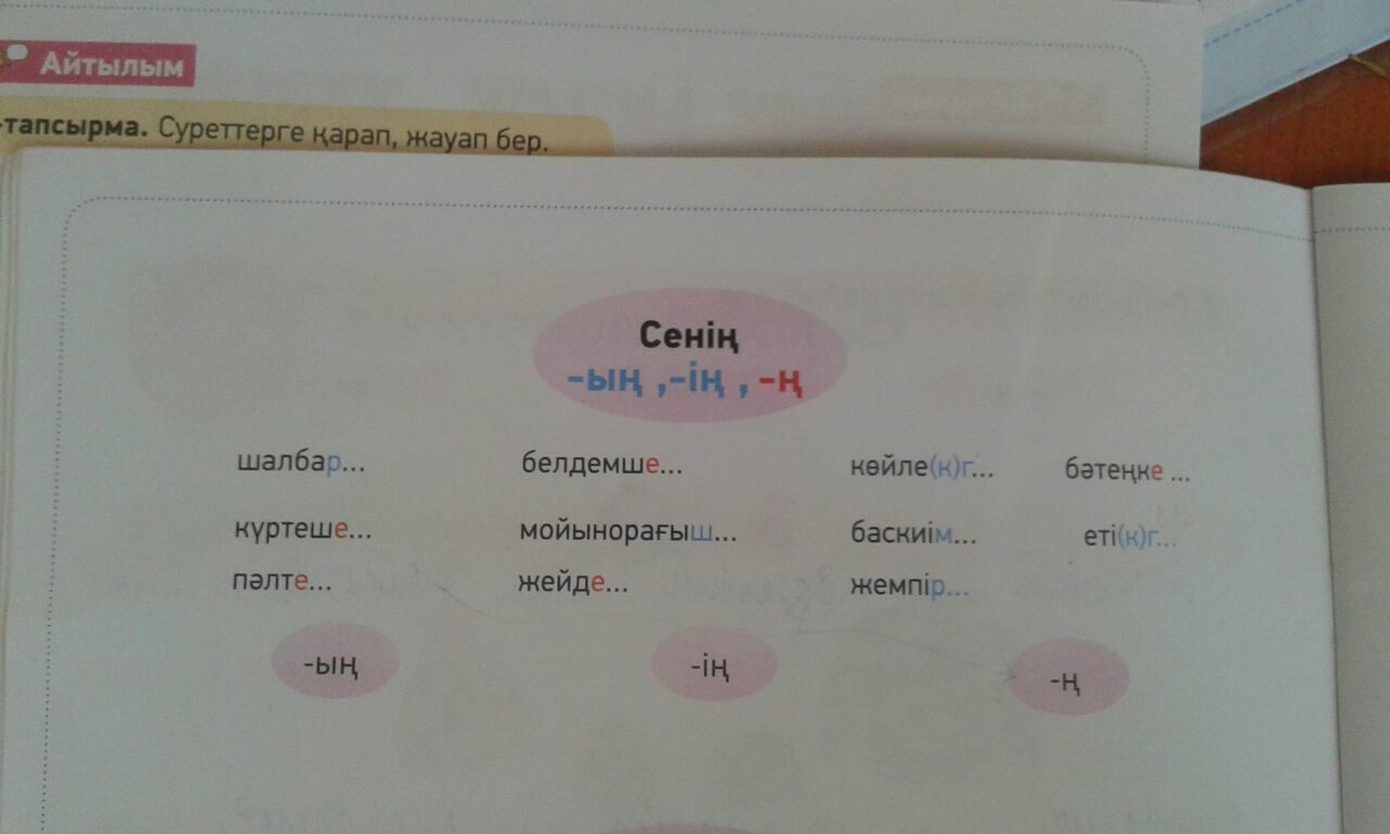 шалбарың, күртешең, пәлтең, белдемшең, мойынорағышың, жейдең, көйлегің, бакскиімің, жемпірің, бәтеңкең, етігің