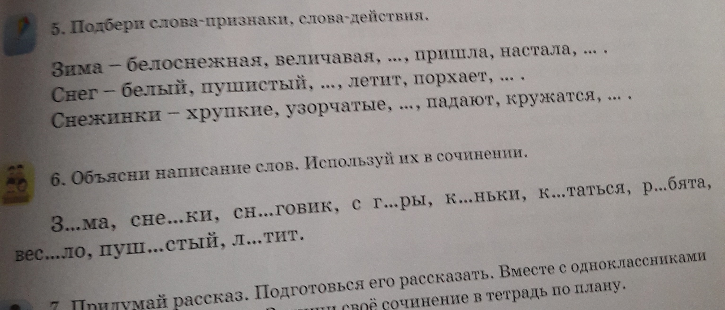 надо написать небольшое сочинение для 2 класса примерно 10-12 предложений. есть вопросы наводящие. Какое сейчас время года чем дети любят заниматься зимой Какое настроение у ребят Какая одежда подходит для зимних развлечений .А также слова которые должны быть в сочинение с 5 и 6 упражнения. тема Мои любимые зимние игры.