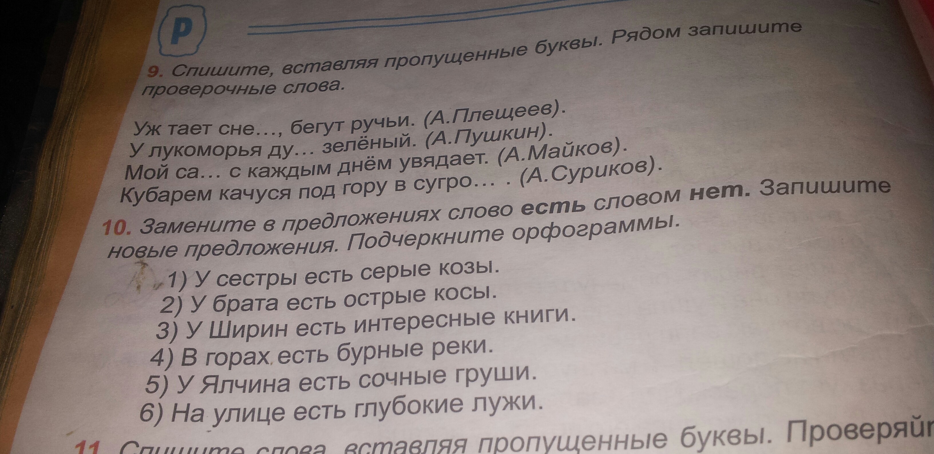 Снег (снега), дуб (дубы), сад (сады), сугроб (сугробы) 10. У сёстры нет серых коз. У брата нет острых кос. У Ширин нет интересных книг. В горах нет бурных рек. У Ялчина нет сочных груш. На улице нет глубоких луж.