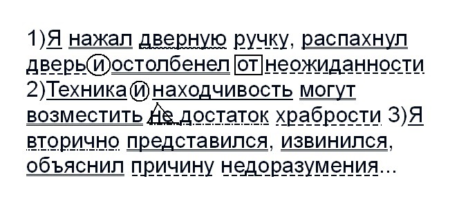 Синтактический разбор предложений: 1)Я нажал дверную ручку, распахнул дверь и остолбенел о неожиданности 2)Техника и находчивость могут возместить не достаток храбрости 3)Я вторично представился , извинился, объяснил причину недоразумения... пж даю 30 баллов!